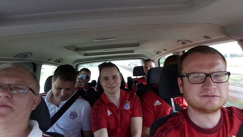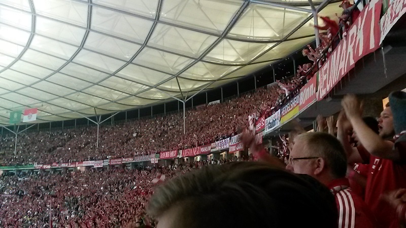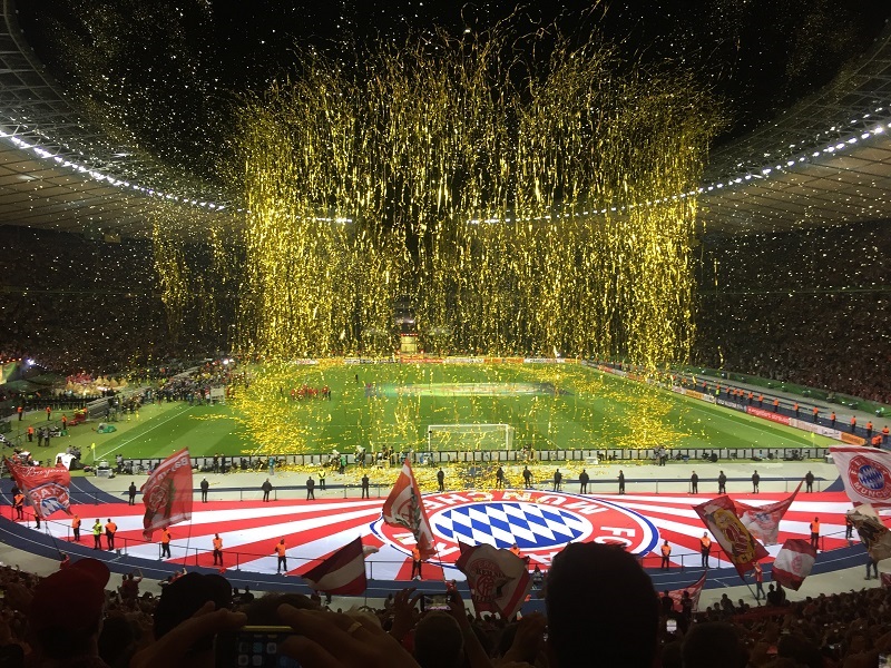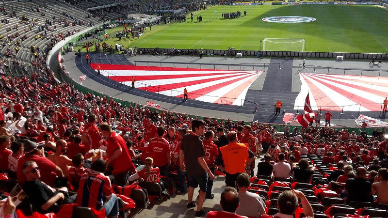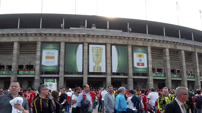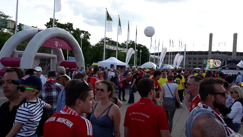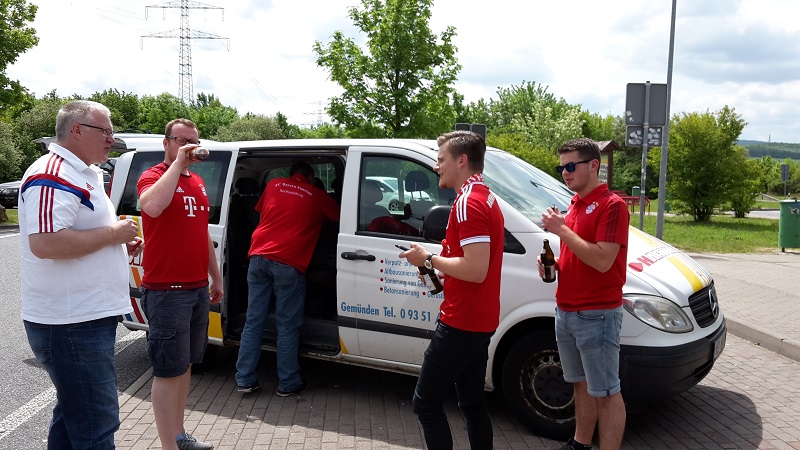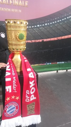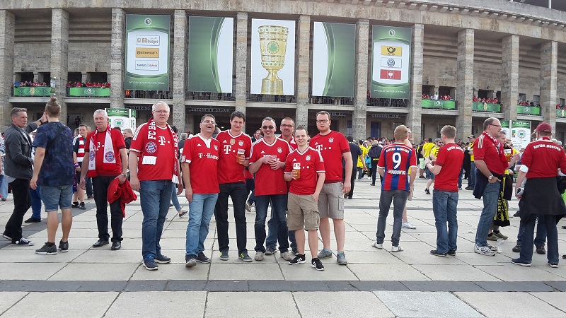 Zum 18. Mal sicherte sich der FC Bayern München am 21. Mai 2016 den DFB-Pokal. Acht Mitglieder unseres Fanclub waren beim zugleich letzten Spiel von Startrainer Pep Guardiola im Berliner Olympiastadion live dabei. Schon auf der Hinreise gab es das ein oder andere Highlight zu bestaunen. Beim Stopp am Imbiss Haase in Magdala verzehrten die Beteiligten genüsslich die originalen Thüringer Bratwürste. Einem Mitglied schmeckten die Thüringer Spezialitäten so gut, dass kurze Zeit später die Hose nicht mehr passte und Schaden davon trug. Deshalb wurde das nächste Outlet nahe Leipzig aufgesucht und die "Männerrunde" konnte erstmal ordentlich shoppen. Neu angekleidet kam die Reisetruppe am Nachmittag im wolkenlosen Berlin an und bereitete sich auf dem Fanfest vor dem altehrwürdigen Olympiastadion auf das Finale gegen den Erzrivalen aus Dortmund vor. Von besten Plätzen aus verfolgten unsere Mitglieder das zwar torlose, aber spannende Spiel zweier an diesem Abend gleichwertigen Mannschaften. Im Elfmeterschießen bewies die Mannschaft des FCB einmal mehr mentale Stärke. Douglas Costa war es, der den entscheidenden Elfmeter im Tor der Dortmunder versenkte und das ganze Stadion zum beben brachte. Glücklich und in Feierlaune wurde auf dem Heimweg noch schnell ein Getränkewagen legal geplündert, bevor dieser ereignisreiche Tag mit der fast fünfstündigen Heimfahrt endete.